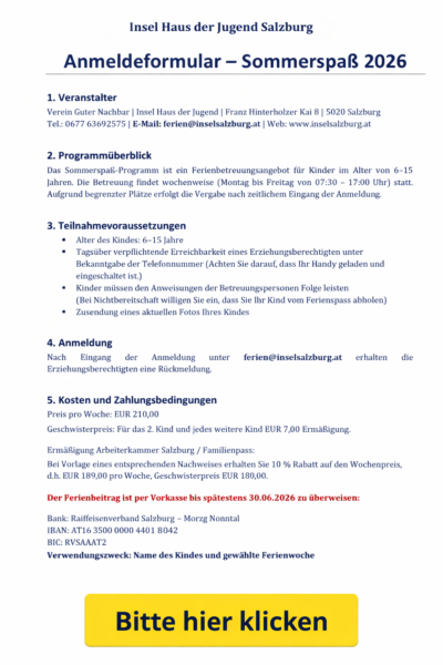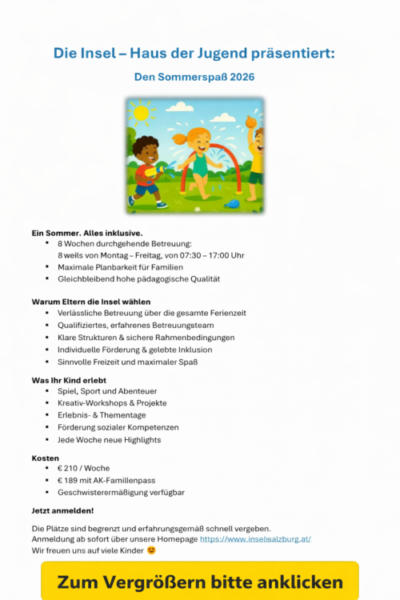 13.07.2026 – 04.09.2026: Sommerspaß 2026. Die Insel hat in diesem Zeitraum von Montag bis Freitag in der Zeit von 7.30 Uhr bis 17.00 Uhr geöffnet.