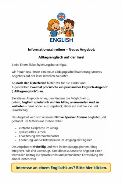 15.05.2026: Zwickeltag nach Christi Himmelfahrt. Die Insel bietet an diesem Tag von 8.00 bis 17.00 Uhr eine Betreuung an.